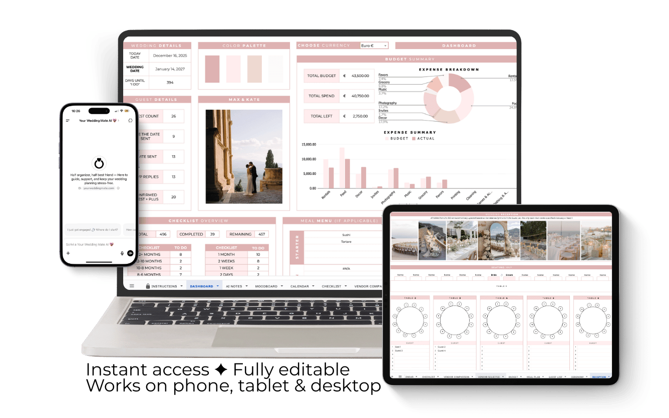 A structured Google Sheets system that keeps your budget, guest list and deadlines perfectly organized.