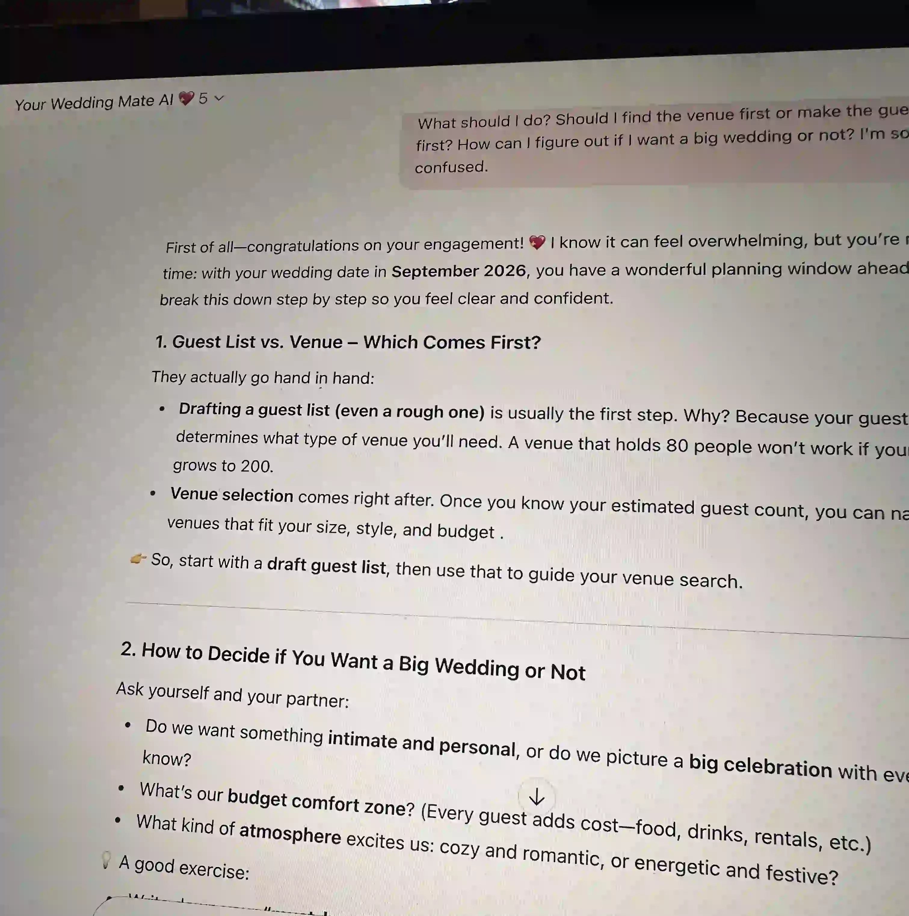 Just wanted to say how impressed I am!! The planner is amazing, but the personalized AI chat takes it to a whole new level. It honestly feels like having my own wedding planner anytime!!!